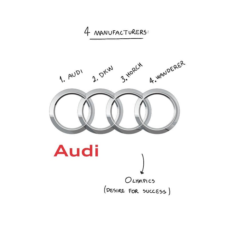 The four ceiling rings of the logo is rather simple to reflect the four automobile manufacturers (Audi, DKW, Horch and Wanderer) of Auto Union.